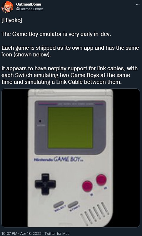 @OatmealDome claims. “Each game is shipped as its own app and has the same icon (shown below),” he added. “It appears to have netplay support for link cables, with each Switch emulating two Game Boys at the same time and simulating a Link Cable between them.”