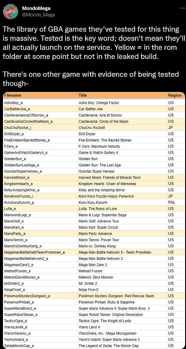 “The library of GBA games they’ve tested for this thing is massive,” he wrote. “Tested is the key word; doesn’t mean they’ll all actually launch on the service.”