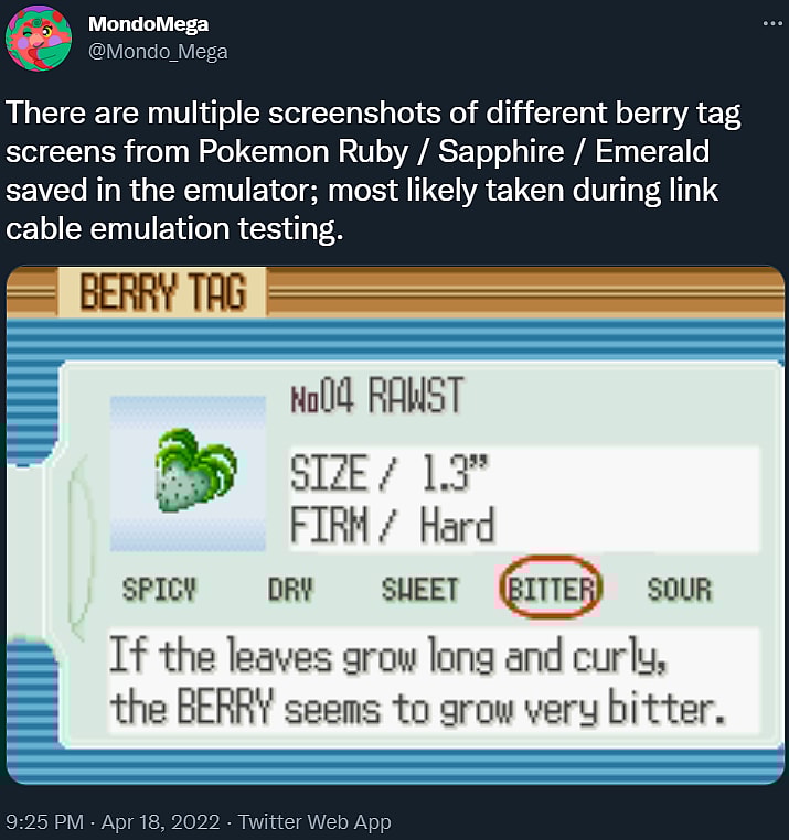 Teasing one more game, @Mondo_Mega added, “There’s one other game with evidence of being tested though. There are multiple screenshots of different berry tag screens from Pokemon Ruby / Sapphire / Emerald saved in the emulator; most likely taken during link cable emulation testing.”