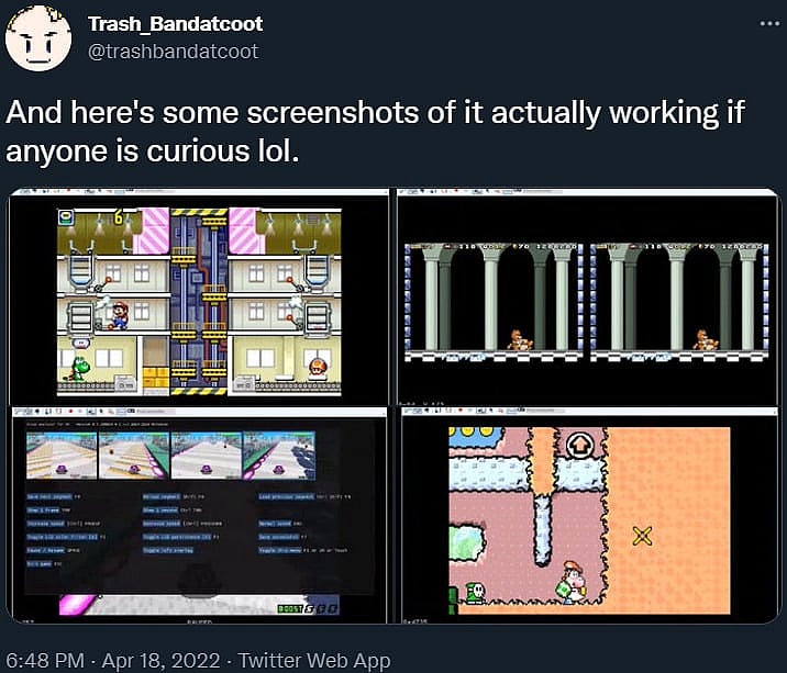 Additionally, @trashbandatcoot shared, “some screenshots of it actually working,” previewing screenshots of Game & Watch Gallery 4, Super Mario Advance 4: Super Mario Bros. 3, Yoshi’s Island: Super Mario Advance 3, and a debug menu for F-Zero: Maximum Velocity.