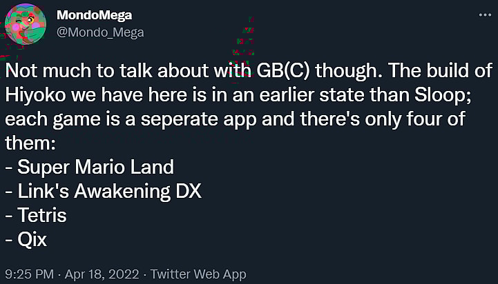 Turning to the topic of the GBA’s younger brother, @Mondo_Mega further claimed, “Not much to talk about with [Game Boy Color]. The build of [the emulator, codenamed] Hiyoko we have here is in an earlier state than [the GBA emulator, codenamed] Sloop.”
