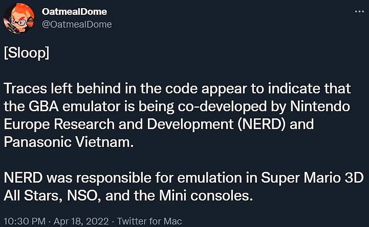 Speaking to the GBA emulator, @OatmealDome then noted that “traces left behind in the code appear to indicate that the GBA emulator is being co-developed by Nintendo Europe Research and Development (NERD) and Panasonic Vietnam,” elaborating, “NERD was responsible for emulation in Super Mario 3D All Stars, NSO, and the Mini consoles”.