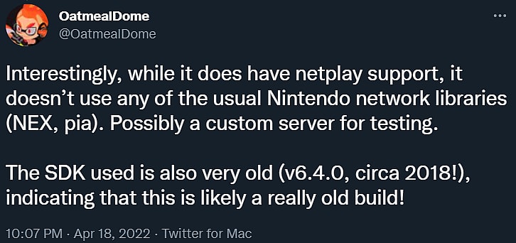 He further explained, “Interestingly, while it does have netplay support, it doesn’t use any of the usual Nintendo network libraries (NEX, pia). Possibly a custom server [being used] for testing. The SDK used is also very old (v6.4.0, circa 2018!), indicating that this is likely a really old build!”