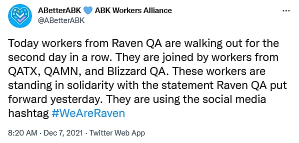 Though the initial walkout took place as scheduled on November 6th, ABK announced the following day that “workers from Raven QA are walking out for the second day in a row.”