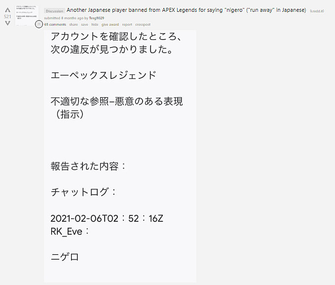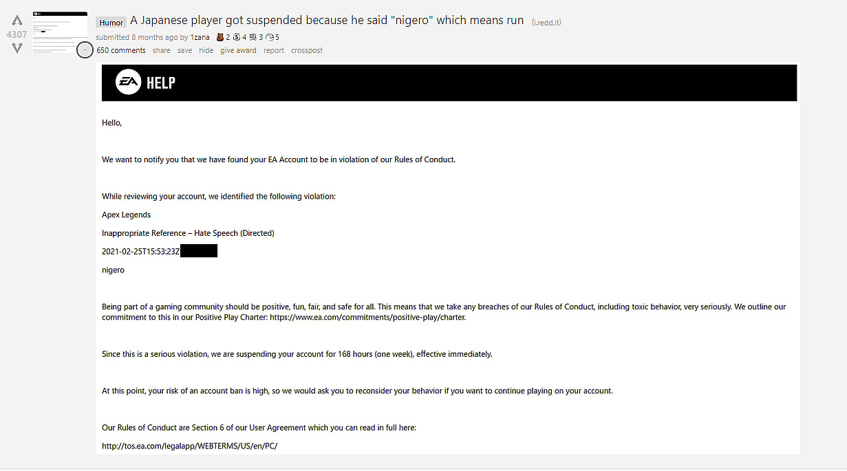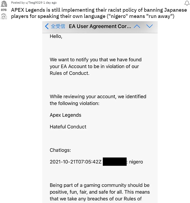 A few days later at the beginning of April, Reddit user Tesg9029 uploaded an alleged email received from Electronic Arts in Japanese claiming, “Another Japanese player banned from APEX Legends for saying ‘nigero’ (‘run away’ in Japanese).