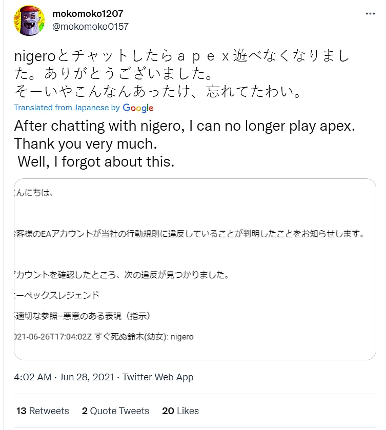 Using Google’s machine translation, the user wrote, “After chatting with nigero, I can no longer play apex. Thank you very much. Well, I forgot about this.”