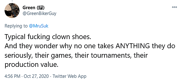 “And they wonder why no one takes ANYTHING they do seriously, their games, their tournaments, their production value,” they concluded.