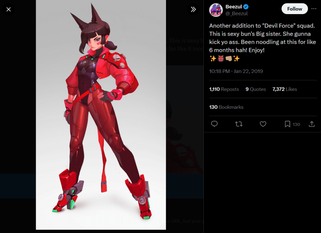 To illustrate his point, Beezul showed how his design took inspirations from multiple sources; Zero Suit Samus from Metroid, Cyberpunk: 2077, Overwatch, classic Capcom fighting games, 90s anime, and others. Nonetheless, it was only ever meant as a study, not for a product.