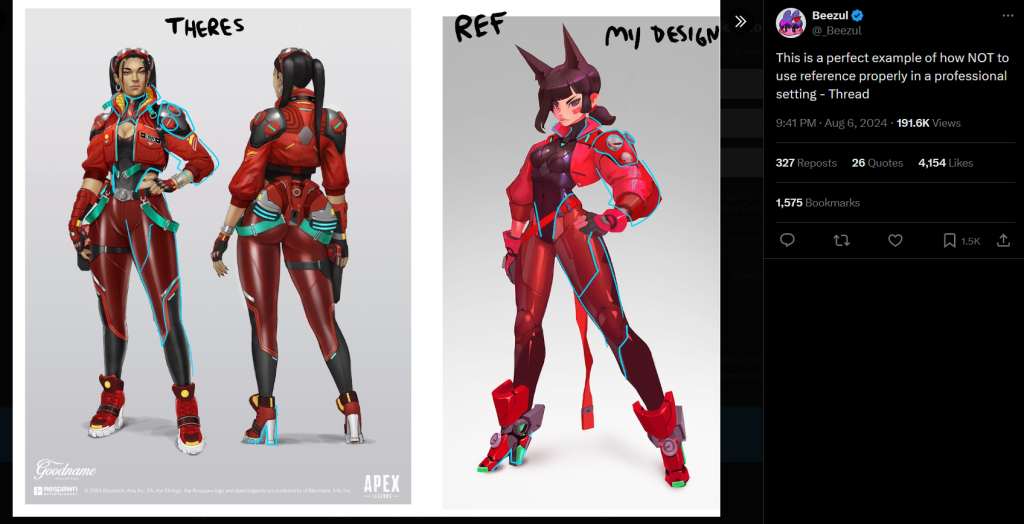 Beezul took to X about two hours after Rastorgueva’s tweet, literally drawing the comparisons himself, noting the similarities between the pieces. This would be in the collars, shoulder armor designs, leotards, the angular seams on the leggings, and even the poses.