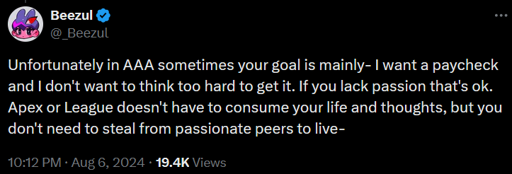 “Unfortunately in AAA sometimes your goal is mainly- I want a paycheck and I don’t want to think too hard to get it. If you lack passion that’s ok. Apex or League doesn’t have to consume your life and thoughts, but you don’t need to steal from passionate peers to live-,” Beezul warned.