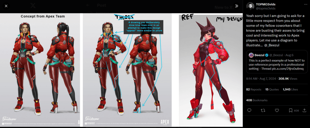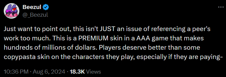 Beezul concluded their thread, emphasizing, “Just want to point out, this isn’t JUST an issue of referencing a peer’s work too much. This is a PREMIUM skin in a AAA game that makes hundreds of millions of dollars. Players deserve better than some copypasta skin on the characters they play, especially if they are paying-“