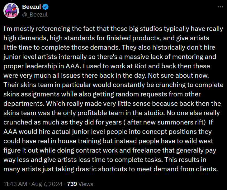“If AAA would hire actual junior level people into concept positions they could have real in house training but instead people have to wild west figure it out while doing contract work and freelance that generally pay way less and give artists less time to complete tasks. This results in many artists just taking drastic shortcuts to meet demand from clients.”