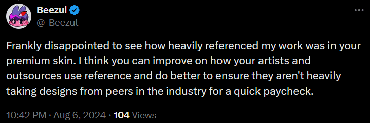“Frankly disappointed to see how heavily referenced my work was in your premium skin. I think you can improve on how your artists and outsources use reference and do better to ensure they aren’t heavily taking designs from peers in the industry for a quick paycheck,” he berated.