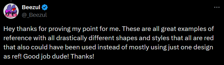 “Hey thanks for proving my point for me,” Beezul retorted. “These are all great examples of reference with all drastically different shapes and styles that all are red that also could have been used instead of mostly using just one design as ref! Good job dude! Thanks!”