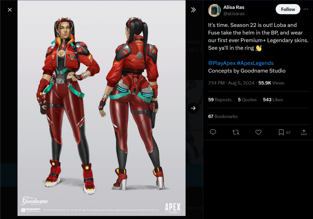 Alisa Rastorgueva, Respawn Entertainment’s External Dev team Associate Art Director, tweeted concept art for Loba’s Battle Pass outfit, giving everyone a full look. She also showed Fuse’s outfit, and the Premium+ variant for both, noting “Concepts by Goodname Studio.”
