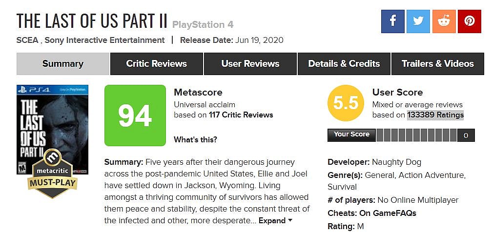 Despite the high sales, the game received mixed reviews from players. The User Score on Metacritic currently sits at 5.5 from 133389 ratings.