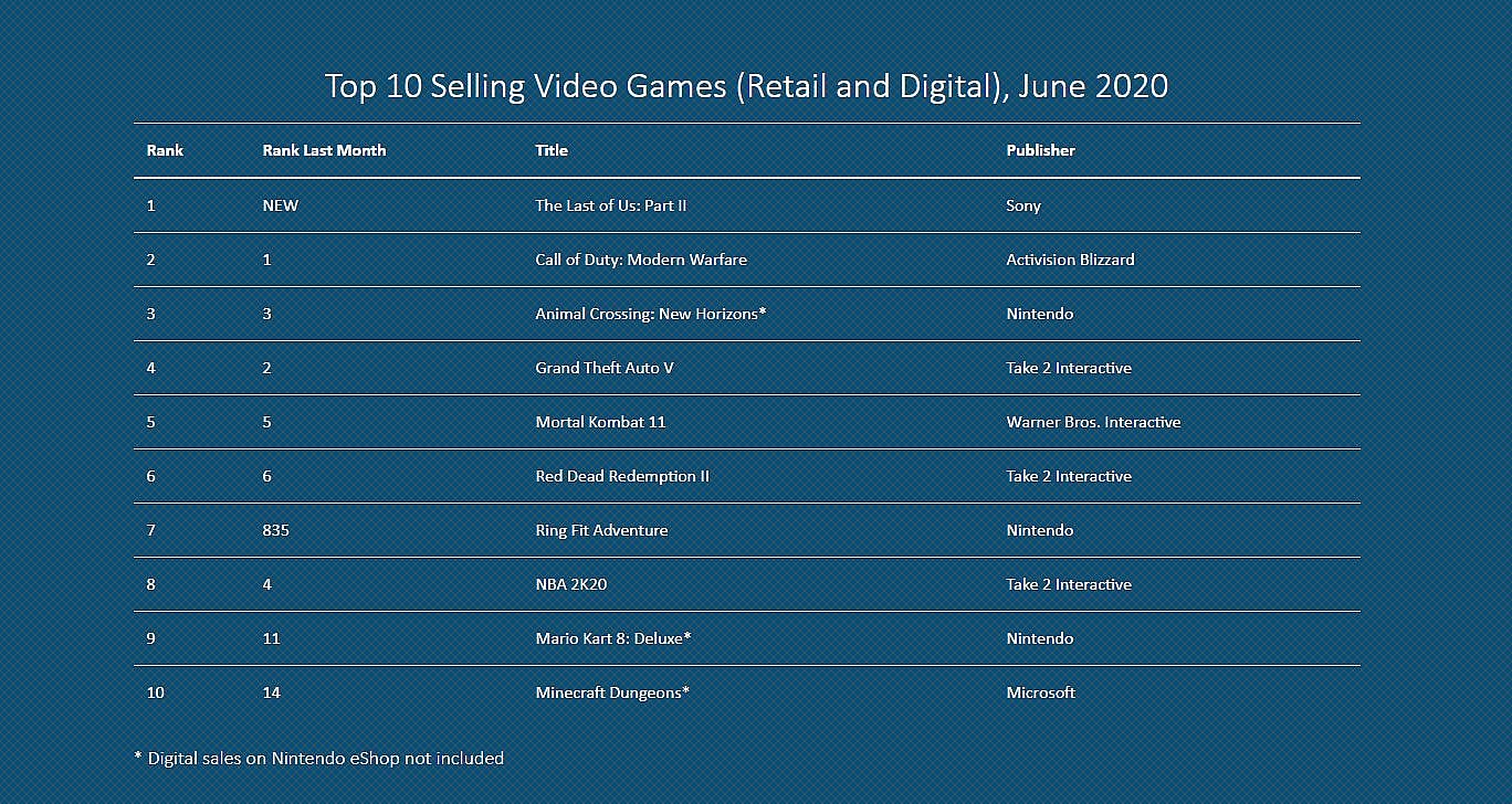 It’s behind Call of Duty: Modern Warfare, NBA 2K20, Madden NFL 20, Borderlands 3, Star Wars: Jedi Fallen Order, Grand Theft Auto V, and Animal Crossing: New Horizons.
