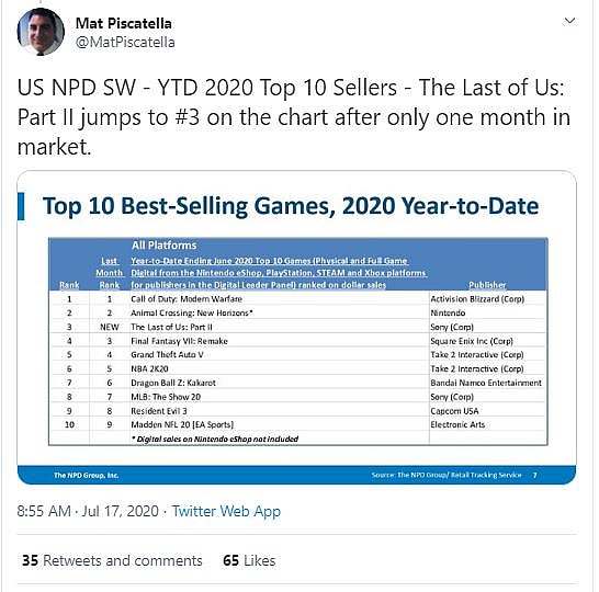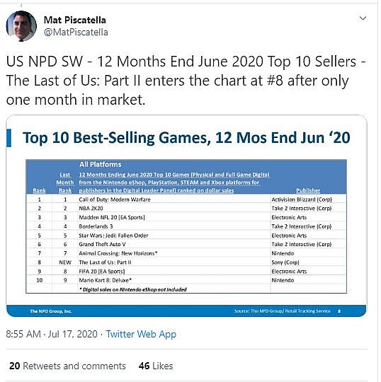 Not only was it the highest selling game in June, but they also reported that the game is currently the third most sold game in 2020.