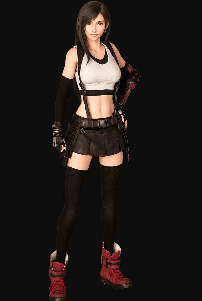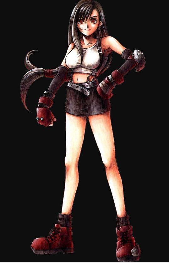 She has dark brown hair, that sometimes appears black. Tifa is typically seen wearing a white crop top with black suspenders and a black skirt.