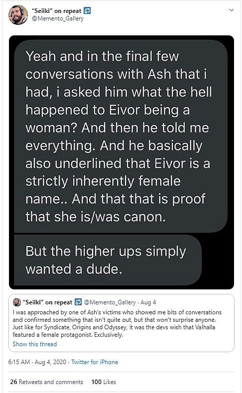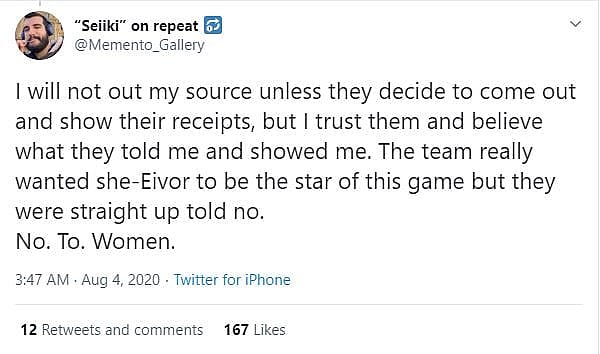 Memento_Gallery then claimed he would not out his source, “I will not out my source unless they decide to come out and show their receipts, but I trust them and believe what they told me and showed me. The team really wanted she-Eivor to be the star of this game but they were straight up told no. No. To. Women.”