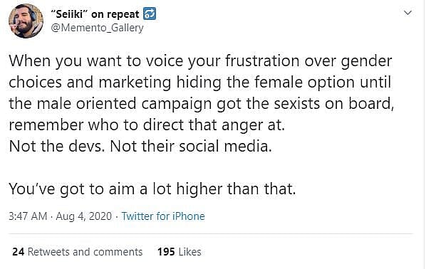 He concluded his thread stating, “When you want to voice your frustration over gender choices and marketing hiding the female option until the male oriented campaign got the sexists on board, remember who to direct that anger at. Not the devs. Not their social media. You’ve got to aim a lot higher than that.”