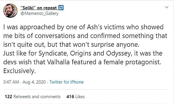 Memento_Gallery explained, “I was approached by one of Ash’s victims who showed me bits of conversations and confirmed something that isn’t quite out, but that won’t surprise anyone. Just like for Syndicate, Origins and Odyssey, it was the devs wish that Valhalla featured a female protagonist. Exclusively.”
