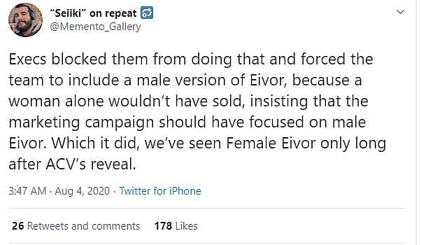 He then continued, “Execs blocked them from doing that and forced the team to include a male version of Eivor, because a woman alone wouldn’t have sold, insisting that the marketing campaign should have focused on male Eivor. Which it did, we’ve seen Female Eivor only long after ACV’s reveal.”