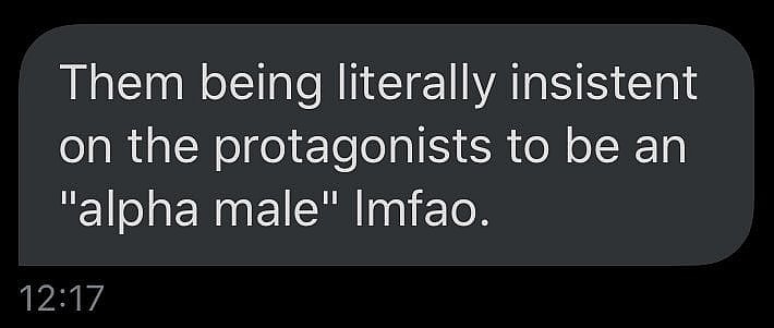 They added in the second screen shot, “Them being literally insistent on the protagonists to be an ‘alpha male’ lmfao.”