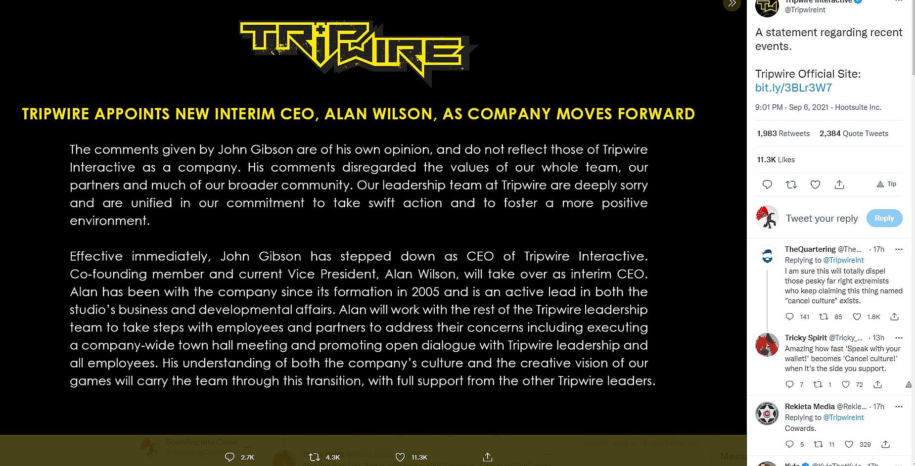 The statement began, “The comments given by John Gibson are of his own opinion, and do not reflect those of Tripwire Interactive as a company. His comments disregarded the values of our whole team, our partners and much of our broader community. Our leadership at Tripwire are deeply sorry and are unified in our commitment to take swift action and to foster a more positive environment.”