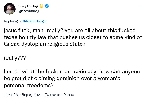 Balrog tweeted, “jesus f***, man. really? you are all about this f***ed texas bounty law that pushes us closer to some kind of Gilead dystopian religious state?”