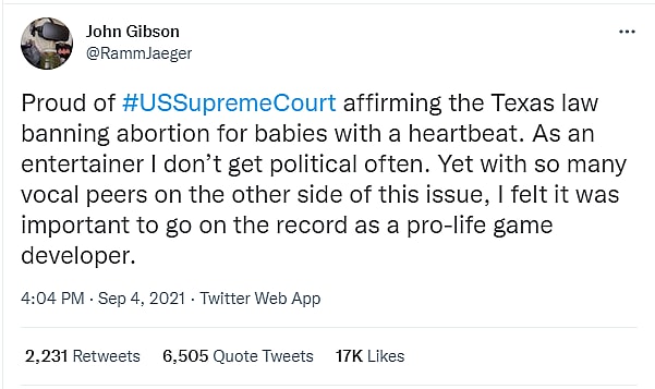 On September 4th, Tripwire Interactive LLC President John Gibson shared his support for Texas’ new pro-life law on Twitter.