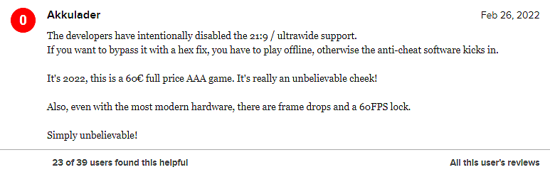 In their zero-score review, Akkulader took issue with how “The developers have intentionally disabled the 21:9 / ultrawide support. If you want to bypass it with a hex fix, you have to play offline, otherwise the anti-cheat software kicks in.”