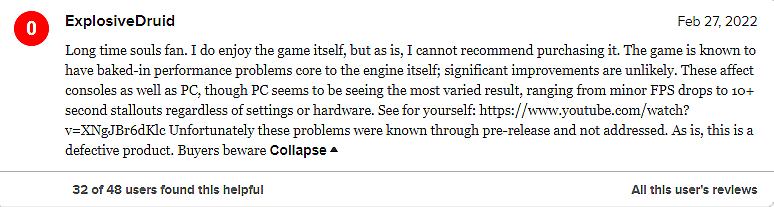 One user, ExplosiveDruid, gave the game an outright zero, writing, “Long time souls fan. I do enjoy the game itself, but as is, I cannot recommend purchasing it.”