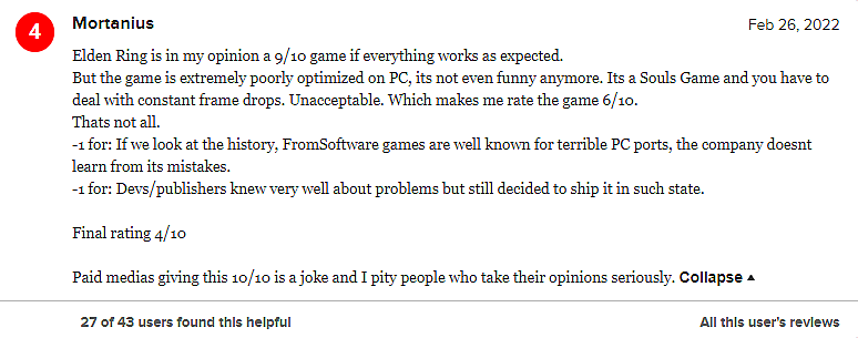 Many of the “Most Helpful” user reviews for Elden Ring on Metacritic also have a score of 3 or less, though even those giving it a higher score acknowledge its current performance flaws.