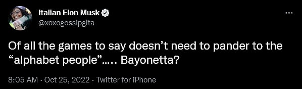 For example, former Kotaku staff writer Gita Jackson – after years of sites like her former employer browbeating people with their sexism accusations towards the heroine – attempted to argue, “Of all the games to say doesn’t need to pander to the ‘alphabet people’….. Bayonetta?”