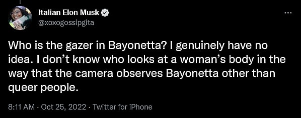 “Who is the gazer in Bayonetta?” she continued. “I genuinely have no idea. I don’t know who looks at a woman’s body in the way that the camera observes Bayonetta other than queer people.”