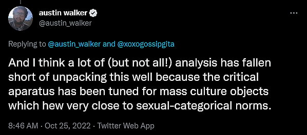 “And I think a lot of (but not all!) analysis has fallen short of unpacking this well because the critical apparatus has been tuned for mass culture objects which hew very close to sexual-categorical norms,” he concluded his revisionist salad of buzzwords.