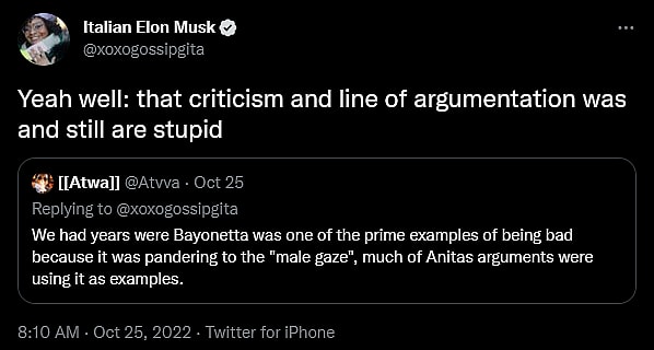 Met with the very real fact, as presented by Twitter user @Atvva, that “We had years were Bayonetta was one of the prime examples of being bad because it was pandering to the ‘male gaze’,” Jackson doubled down on her rewriting of history by declaring, “Yeah well: that criticism and line of argumentation was and still are stupid.”