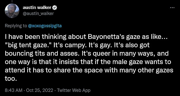 “I have been thinking about Bayonetta’s gaze as like… ‘big tent gaze,'” he attempted to rationalize to himself. “It’s campy. It’s gay. It’s also got bouncing tits and asses. It’s queer in many ways, and one way is that it insists that if the male gaze wants to attend it has to share the space with many other gazes too.”