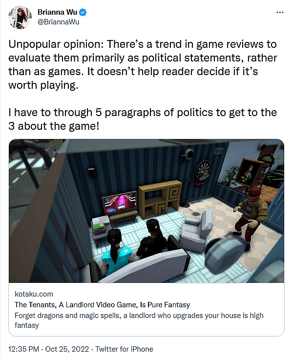 This even includes notorious GamerGate figure Briana Wu, who in a now-deleted tweet from October 25th found herself so fed up with this trend that she professed, “Unpopular Opinion: There’s a trend in game reviews to evaluate them primarily as political statements, rather than as games.”