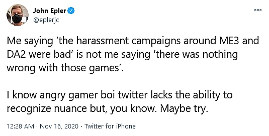 “I know angry gamer boi twitter lacks the ability to recognize nuance but, you know,” Epler condescendingly stated. “Maybe try.”