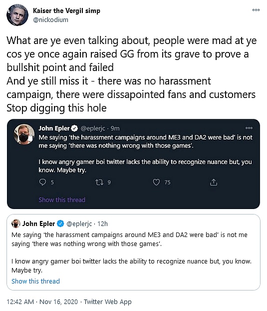 However, one particular Twitter user, @nickodium, took issue with Epler’s framing of the situation, and responded to his tweet about ‘angry gamer boi twitter’ by noting that “people were mad at ye cos ye once again raised GG from its grave to prove a bullshit point and failed” and further asserting that “there was no harassment campaign, there were dissapointed fans and customers”.