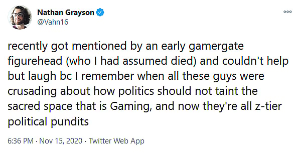Epler’s hyperbolic claim was made in response to a tweet by Nathan Grayson, in which the Kotaku Senior Reporter commented on his recent mentioning “by an early gamergate figurehead” and gleefully noting how he could “remember when all these guys were crusading about how politics should not taint the sacred space that is Gaming, and now they’re all z-tier political pundits”.