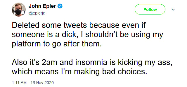 Shortly after the publication of these tweets to @nickodium, Epler would announce that he deleted the tweets in question “because even if someone is a dick, I shouldn’t be using my platform to go after them” and blame his decision to out on his “insomnia”, which he claimed was “kicking my ass, which means I’m making bad choices.”
