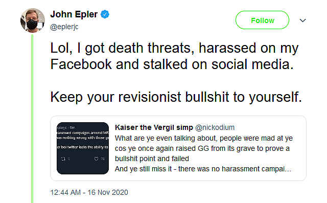 Unsurprisingly, Epler dismissed the user’s attempt to correct the narrative by stating that he had received “death threats”, was “harassed on my Facebook and stalked on social media”, due to the alleged actions of Gamergate supporters.