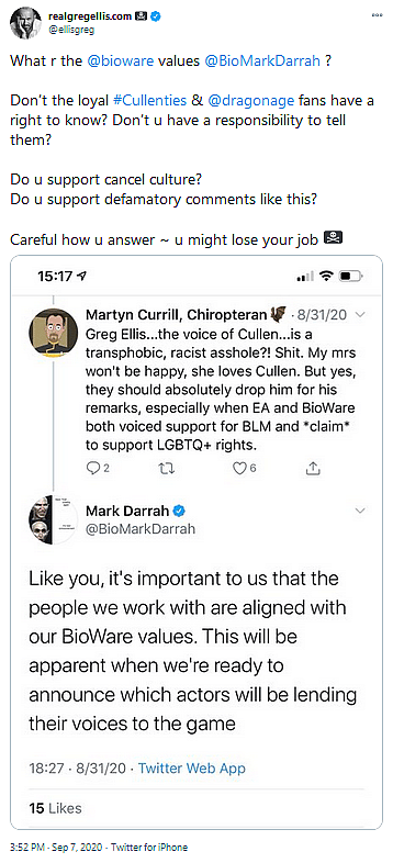 Following Darrah’s comment, Ellis asked the producer “what are the @bioware values”, specifically wondering if these values included support for “cancel culture” and “defamatory comments.”