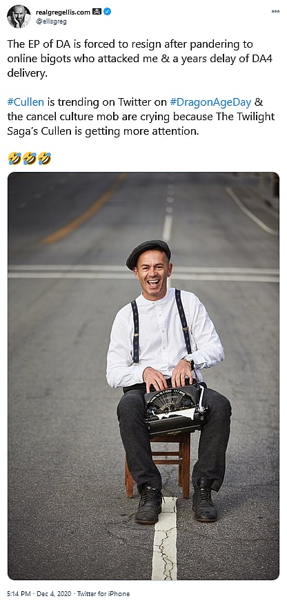 He found further amusement in how “#Cullen is trending on Twitter on #DragonAgeDay & the cancel culture mob are crying because The Twilight Saga’s Cullen is getting more attention.”