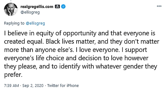 He added, “I believe in equity of opportunity and that everyone is created equal. Black lives matter, and they don’t matter more than anyone else’s. I love everyone. I support everyone’s life choice and decision to love however they please, and to identify with whatever gender they prefer.”