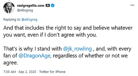 He also declared, “That is why I stand with @jk_rowling, and, with every fan of @DragonAge, regardless of whether or not we agree.”
