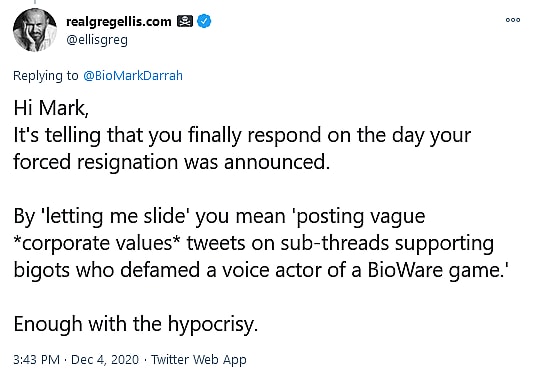 Not one to back down from a public argument, Ellis shared how he found it “telling that you finally respond on the day your forced resignation was announced,” and asked if “by ‘letting me slide’ you mean ‘posting vague *corporate values* tweets on sub-threads supporting bigots who defamed a voice actor of a BioWare game.’”